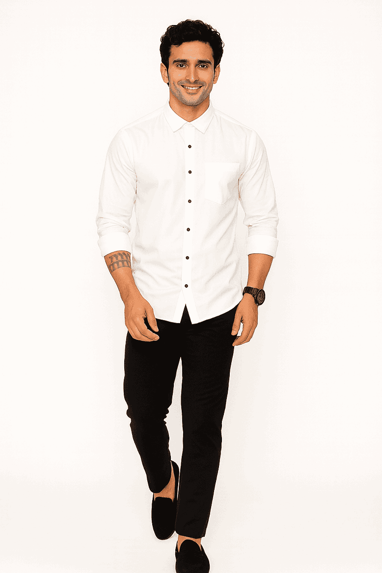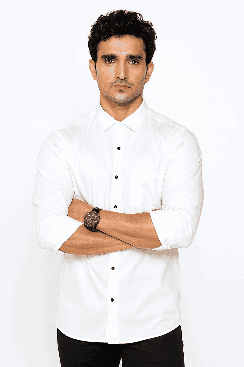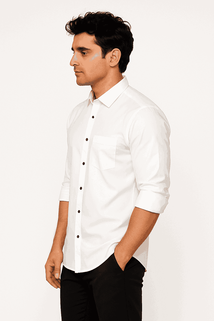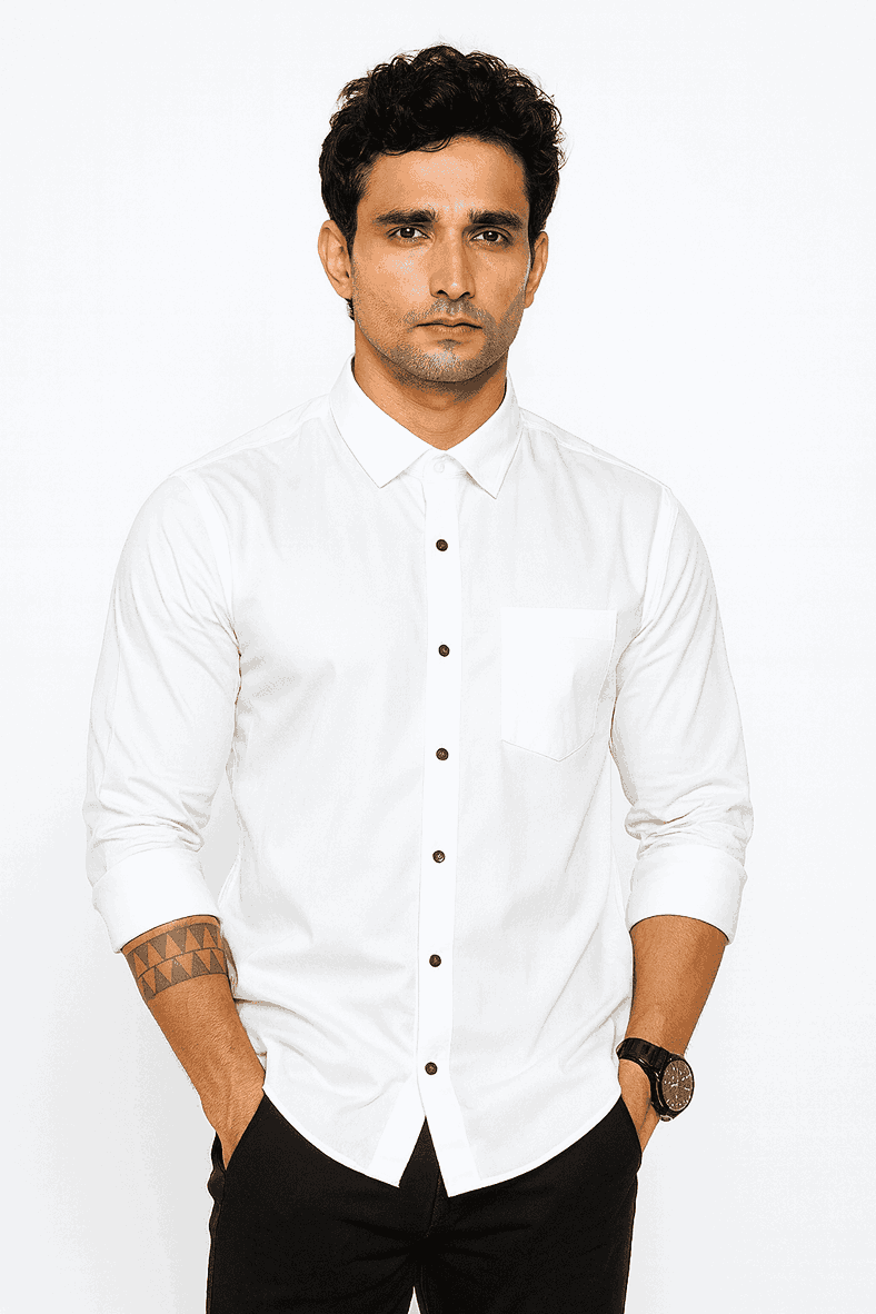 Upgrade your wardrobe with this premium white formal shirt, tailored to offer a clean, crisp, and sophisticated look. Made with soft, breathable fabric, it ensures all-day comfort while maintaining a polished appearance. The shirt features a classic spread collar, contrast buttons, a neatly stitched chest pocket, and full sleeves with a smooth fall.